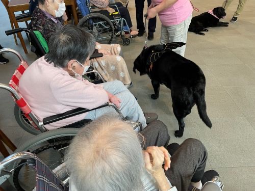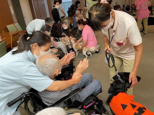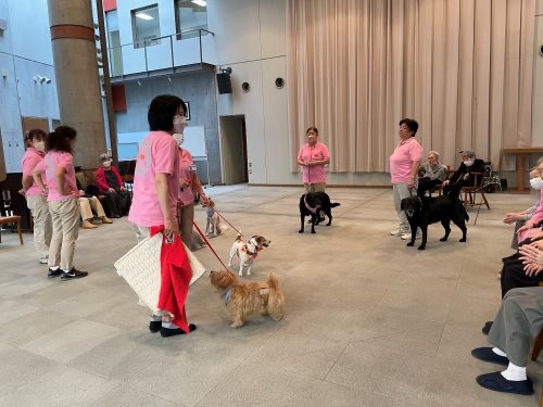 4か月ぶりに救助犬ボランティアの方々がホームを訪問してくださいました。ふれあいの時間では、多くの方が自然と笑顔になり、なでたり、抱きしめたりしながら交流されていました。